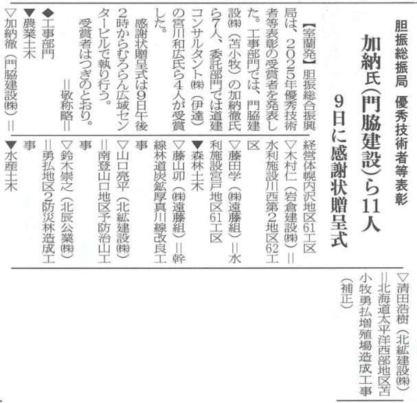 令和 2年 2月 胆振総合振興局より優秀技術者等感謝状を受賞