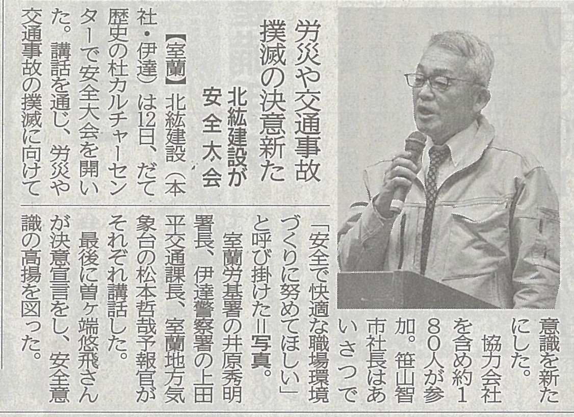 4月14日、だて歴史の杜カルチャーセンター講堂で、当社社員・協力会 約150名参加の中で安全大会を開催しました。ここ数年はコロナ禍で中止をしていましたが、4年ぶりに開催しました。今年度は、室蘭労働基準監督署第2方面主任監督官の山崎太一様と伊達警察署交通課長の小野克典様から講話をいただき、弊社の河島専務取締役土木部長から安全計画を説明を行いました。また、建設業労働災害防止協会北海道支部安全管理士の小林昭夫様より安全講話をいただきました。最後に弊社職員による無事故や無災害を誓う決意宣言を行いました。 社長挨拶 職員による決意宣言 ※北海道通信社 R5/4/18