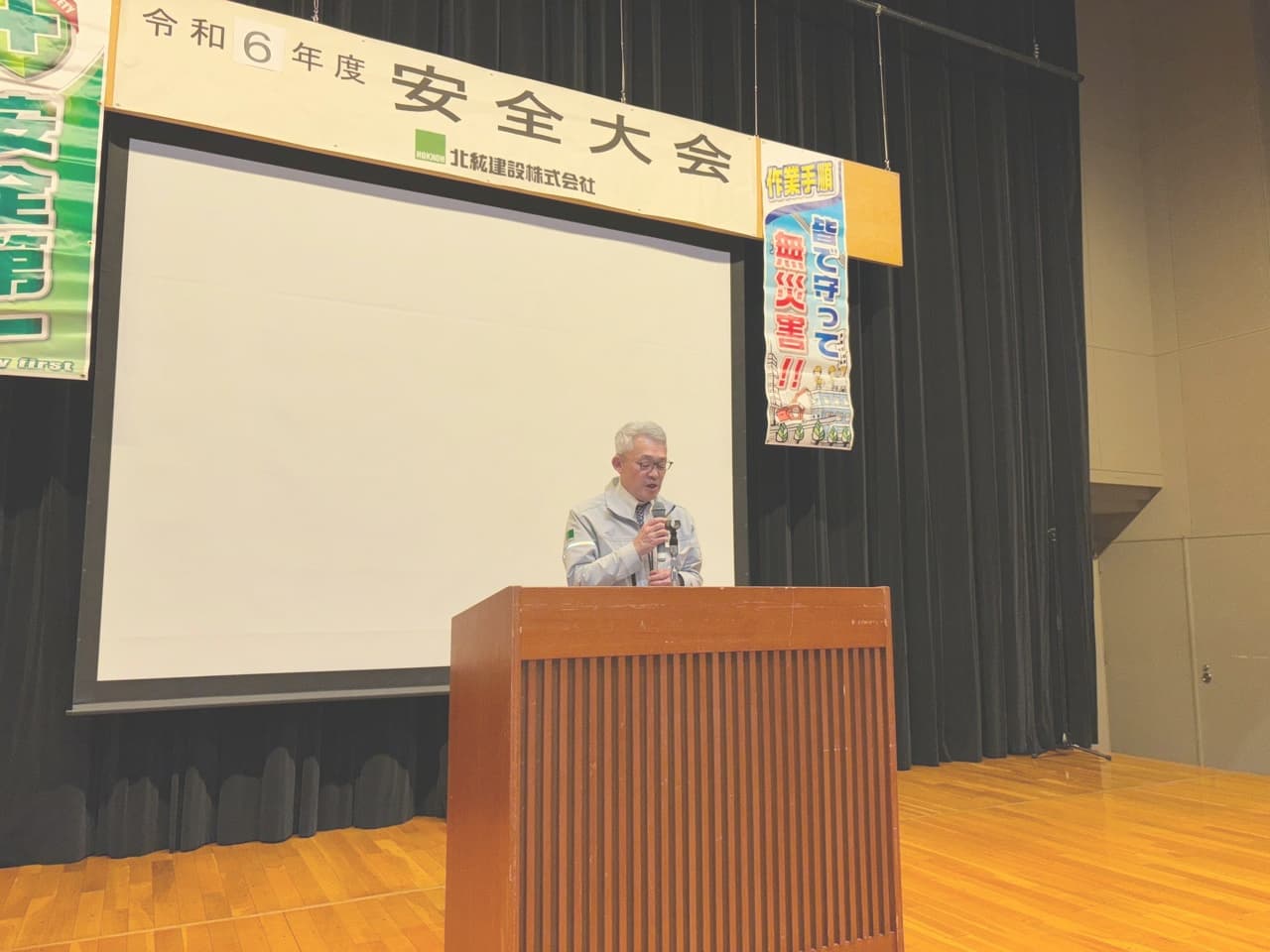 4月11日、だて歴史の杜カルチャーセンター講堂で、当社社員・協力会 約140名参加の中で安全大会を開催しました。今年度は、室蘭労働基準監督副署長の五島弘章様と北海道札幌方面伊達警察署交通課長の上田平様から講話をいただき、弊社の鈴木執行役員副部長が安全計画の説明を行いました。また、弊社の河島取締役土木部長が「安全パトロールのポイント」と題し安全講話行いました。最後に弊社職員による無事故や無災害を誓う決意宣言を行いました。 社長挨拶 職員による決意宣言 ※北海道通信 R7/4/15
