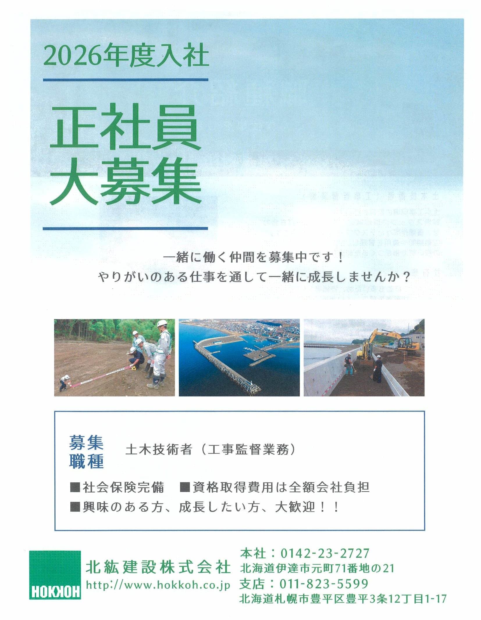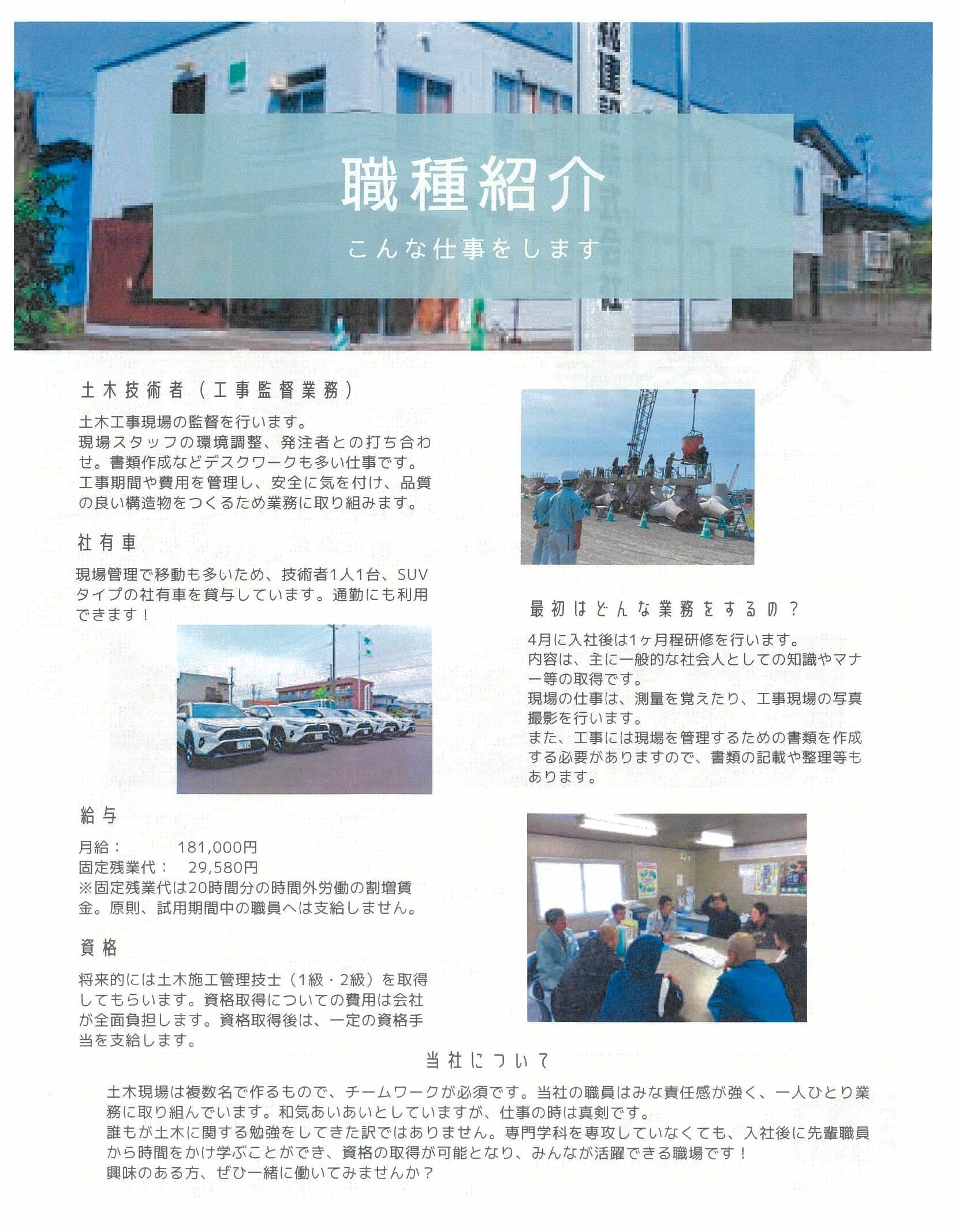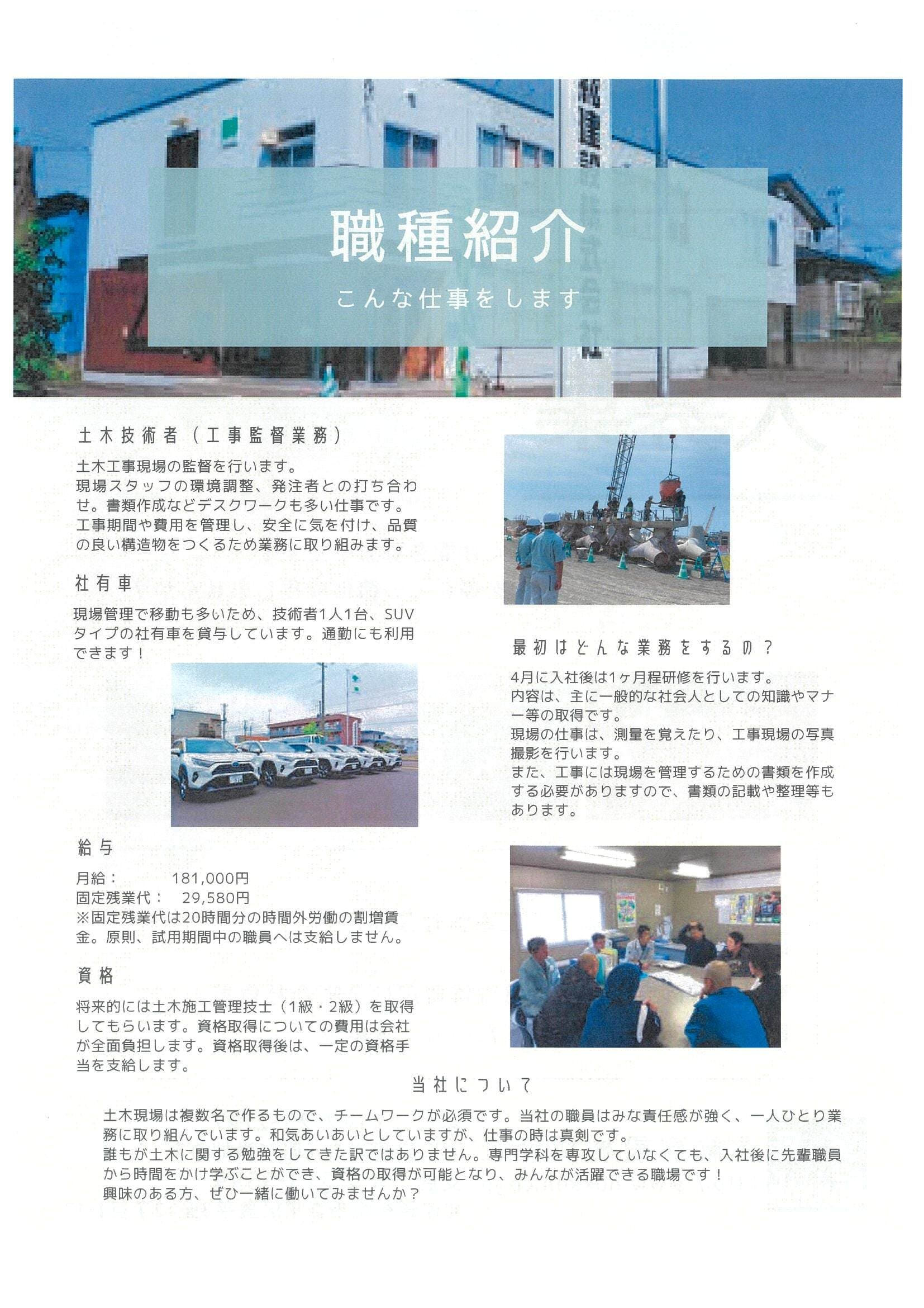 | 内容 | 工事の現場監督の補佐を行っていただきます。 主な業務として、現場の写真撮影、書類整理、測量等があります。 将来的には土木施工管理技士の資格取得を目指してください。 |