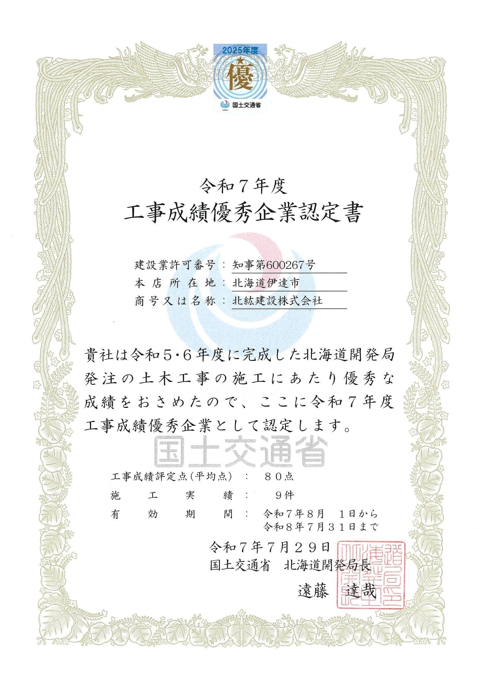 令和 元年 7月 北海道開発局より工事成績優秀企業認定書を授与