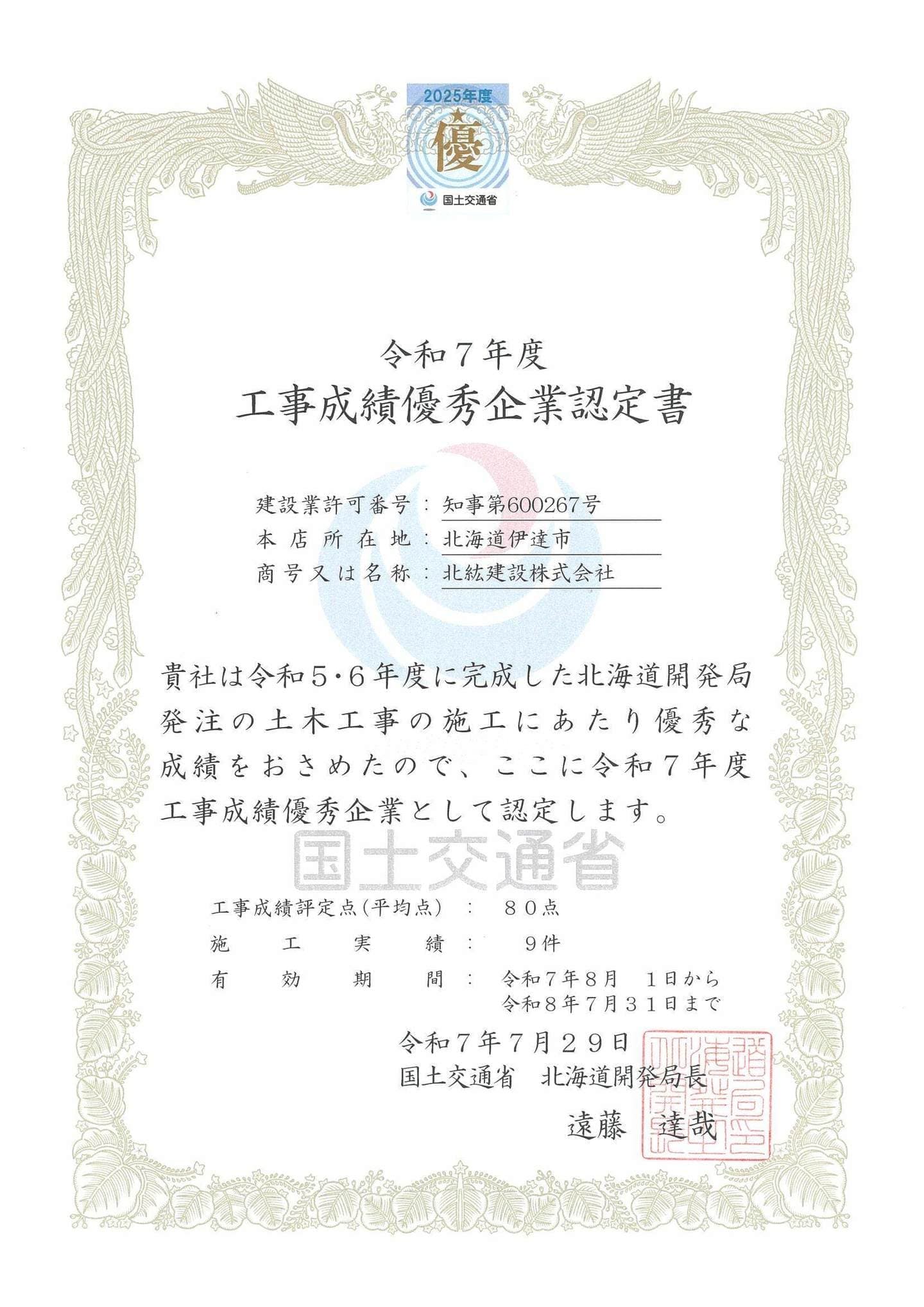 令和 元年 7月 北海道開発局より工事成績優秀企業認定書を授与