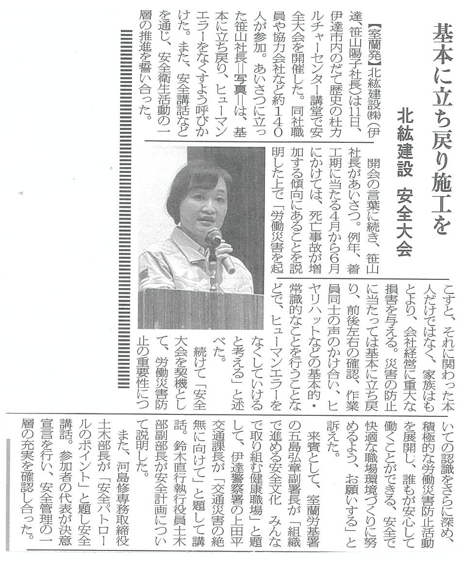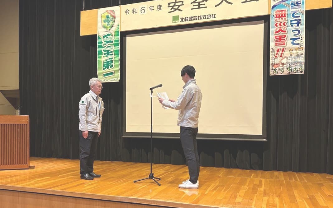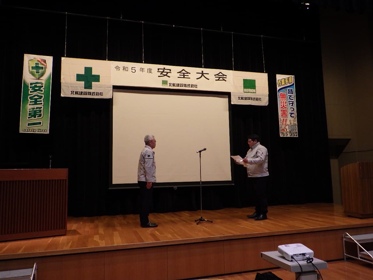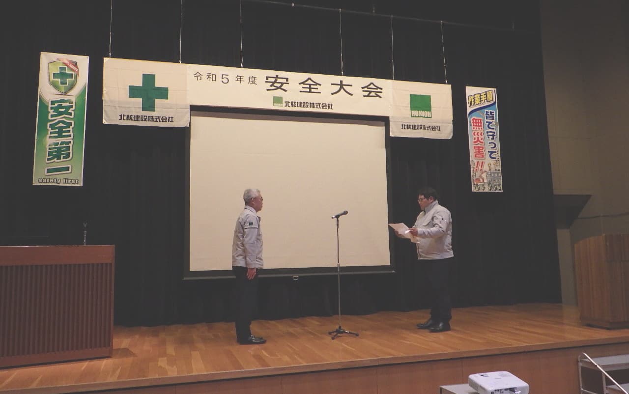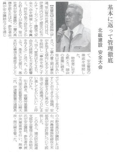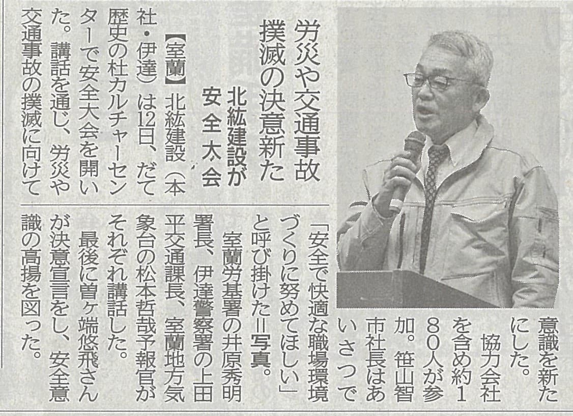 4月12日、だて歴史の杜カルチャーセンター講堂で、当社社員・協力会 約150名参加の中で安全大会を開催しました。今年度は、室蘭労働基準監督署長の伊原秀明様と北海道札幌方面伊達警察署交通課長の上田平様から講話をいただき、弊社の河島専務取締役土木部長が安全計画の説明を行いました。また、室蘭地方気象台予報官の松本哲哉様より安全講話をいただきました。最後に弊社職員による無事故や無災害を誓う決意宣言を行いました。 社長挨拶 職員による決意宣言 ※北海道建設新聞 R6/4/16