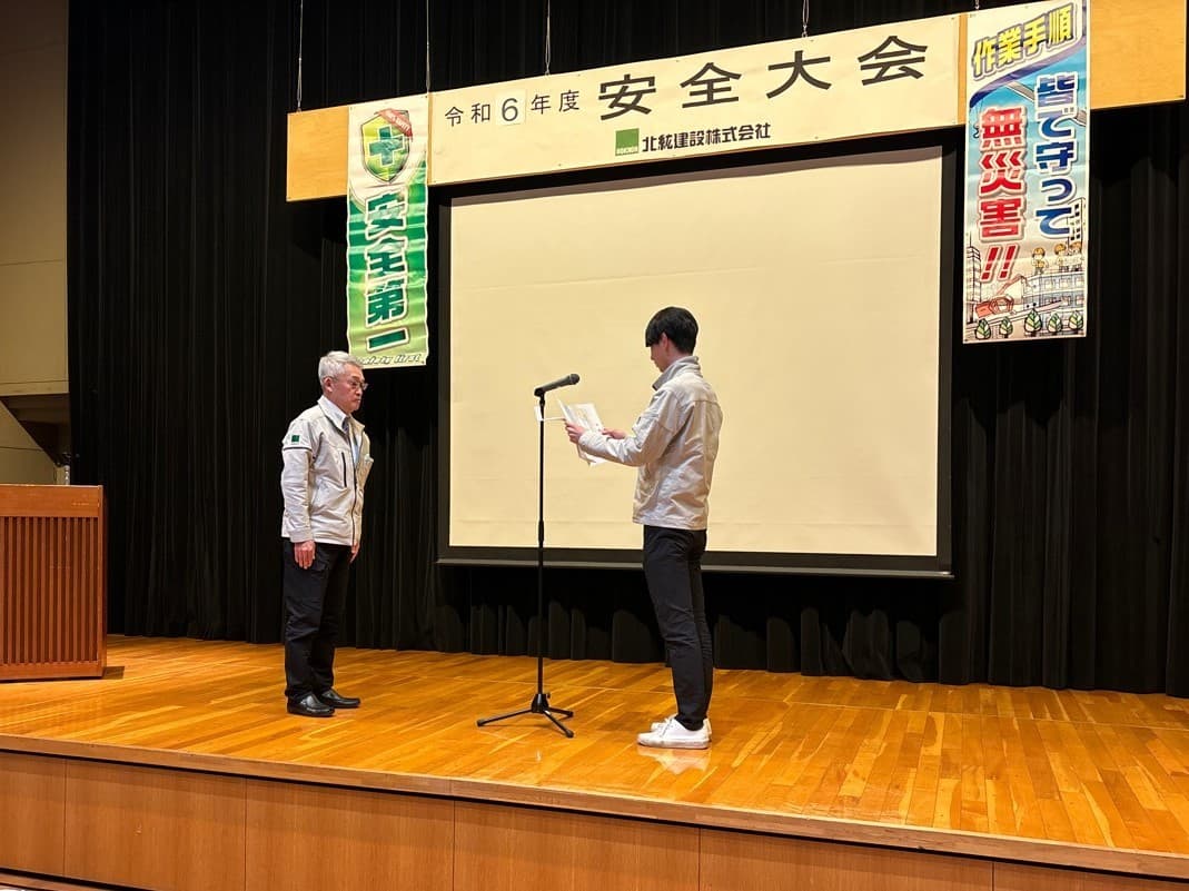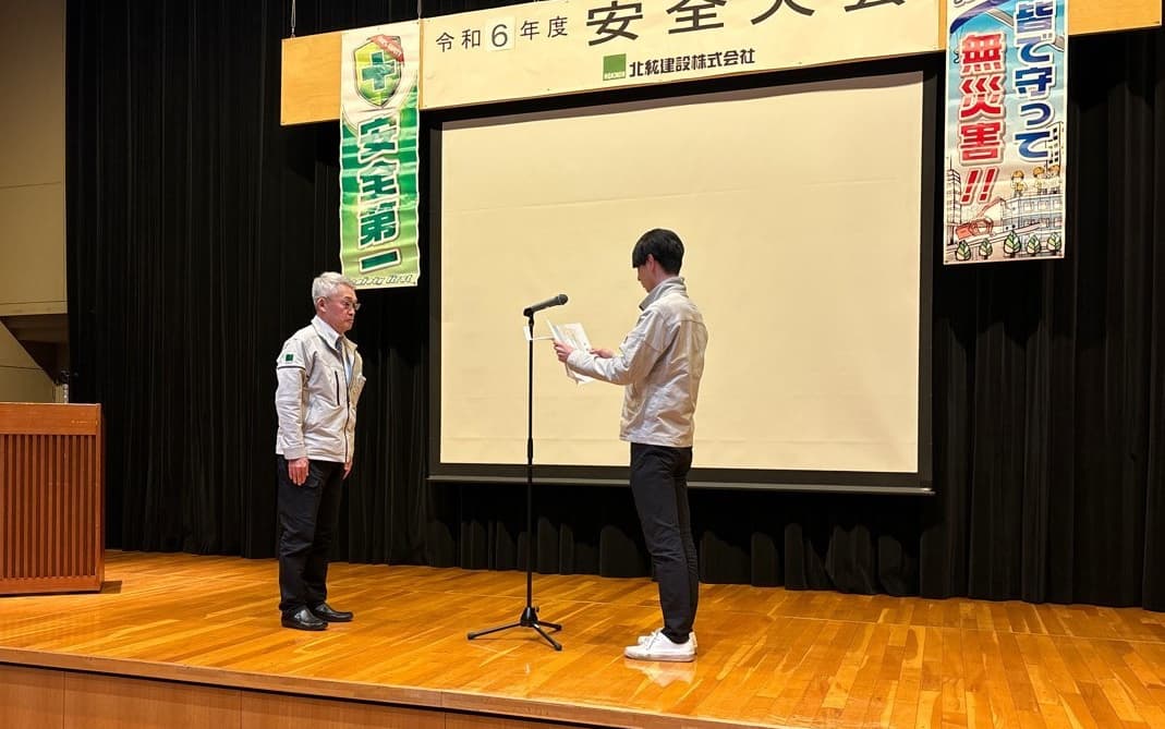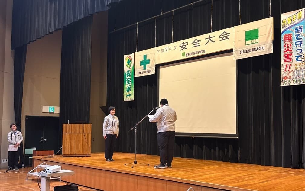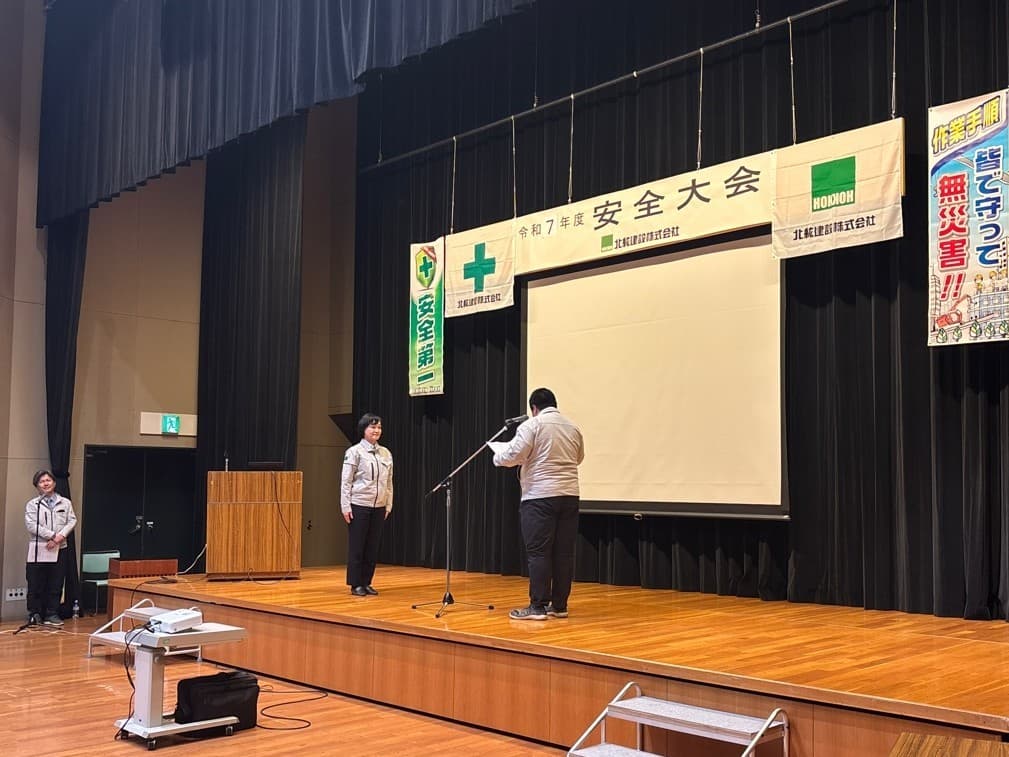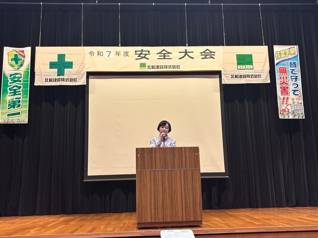 4月11日、だて歴史の杜カルチャーセンター講堂で、当社社員・協力会 約140名参加の中で安全大会を開催しました。今年度は、室蘭労働基準監督副署長の五島弘章様と北海道札幌方面伊達警察署交通課長の上田平様から講話をいただき、弊社の鈴木執行役員副部長が安全計画の説明を行いました。また、弊社の河島取締役土木部長が「安全パトロールのポイント」と題し安全講話行いました。最後に弊社職員による無事故や無災害を誓う決意宣言を行いました。 社長挨拶 職員による決意宣言 ※北海道通信 R7/4/15