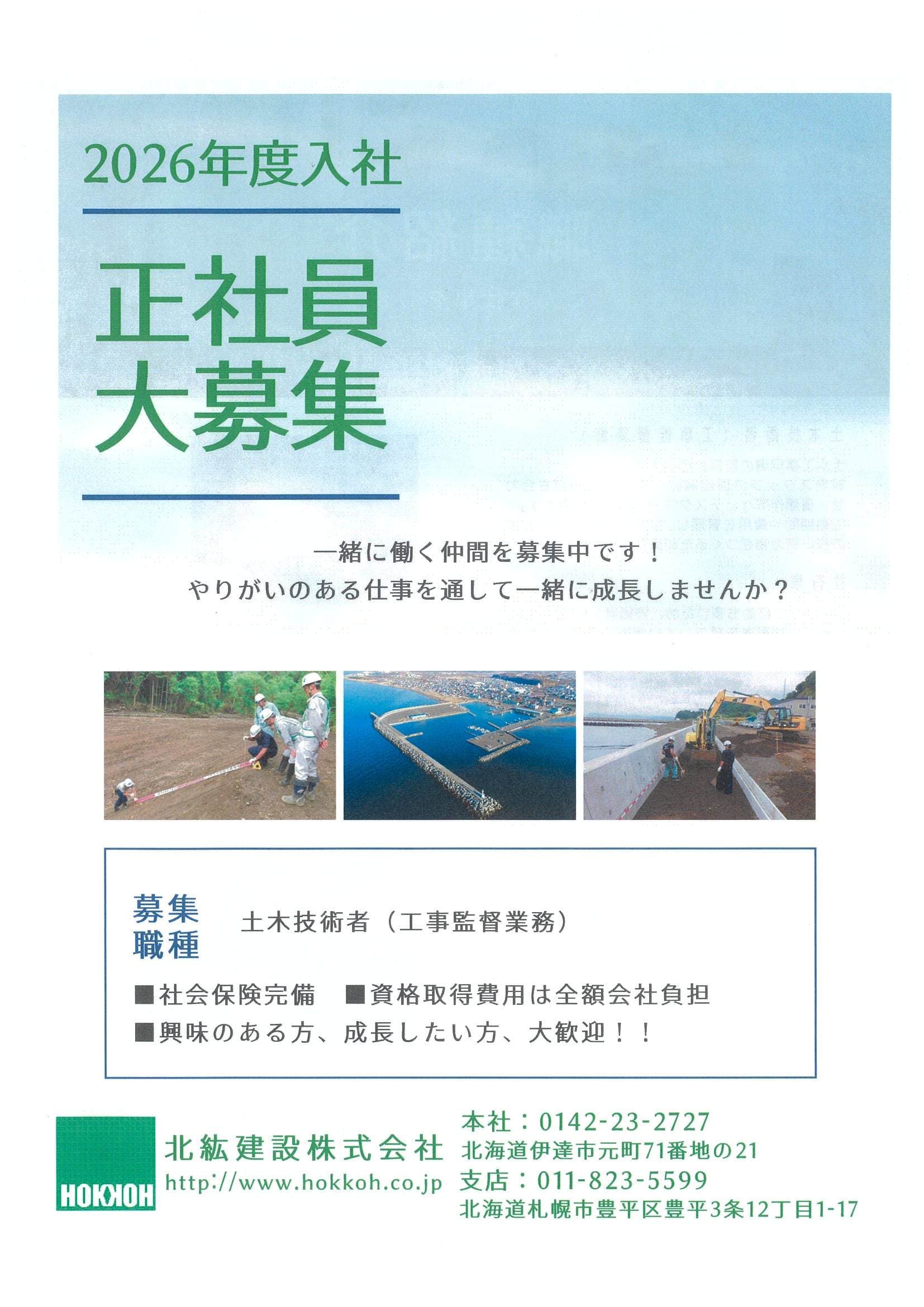 | 内容 | 工事の現場監督の補佐を行っていただきます。 主な業務として、現場の写真撮影、書類整理、測量等があります。 将来的には土木施工管理技士の資格取得を目指してください。 |